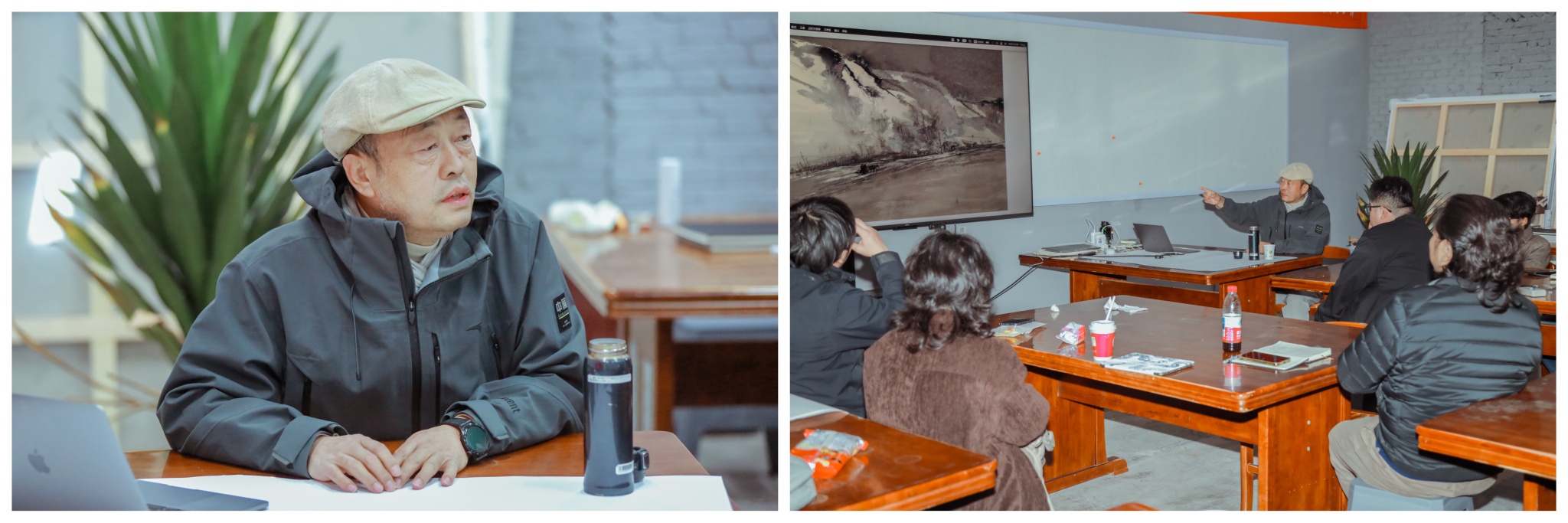 28日,崔全顺教授还通过创作作品的方式亲自为学员们示范创作技法。在基地的理论教室里,他的创作受到了学员们的围观。崔老师一边画,一边从构图、形式表达、画面元素的主次关系、空间节奏的把控、色彩与形式的协调统一等方面,及时与学员们进行分享。学员们也专注聆听、积极互动,围绕东北乡土题材的形式创新展开热烈讨论,在思维碰撞中拓宽创作视野,明晰创作方向。