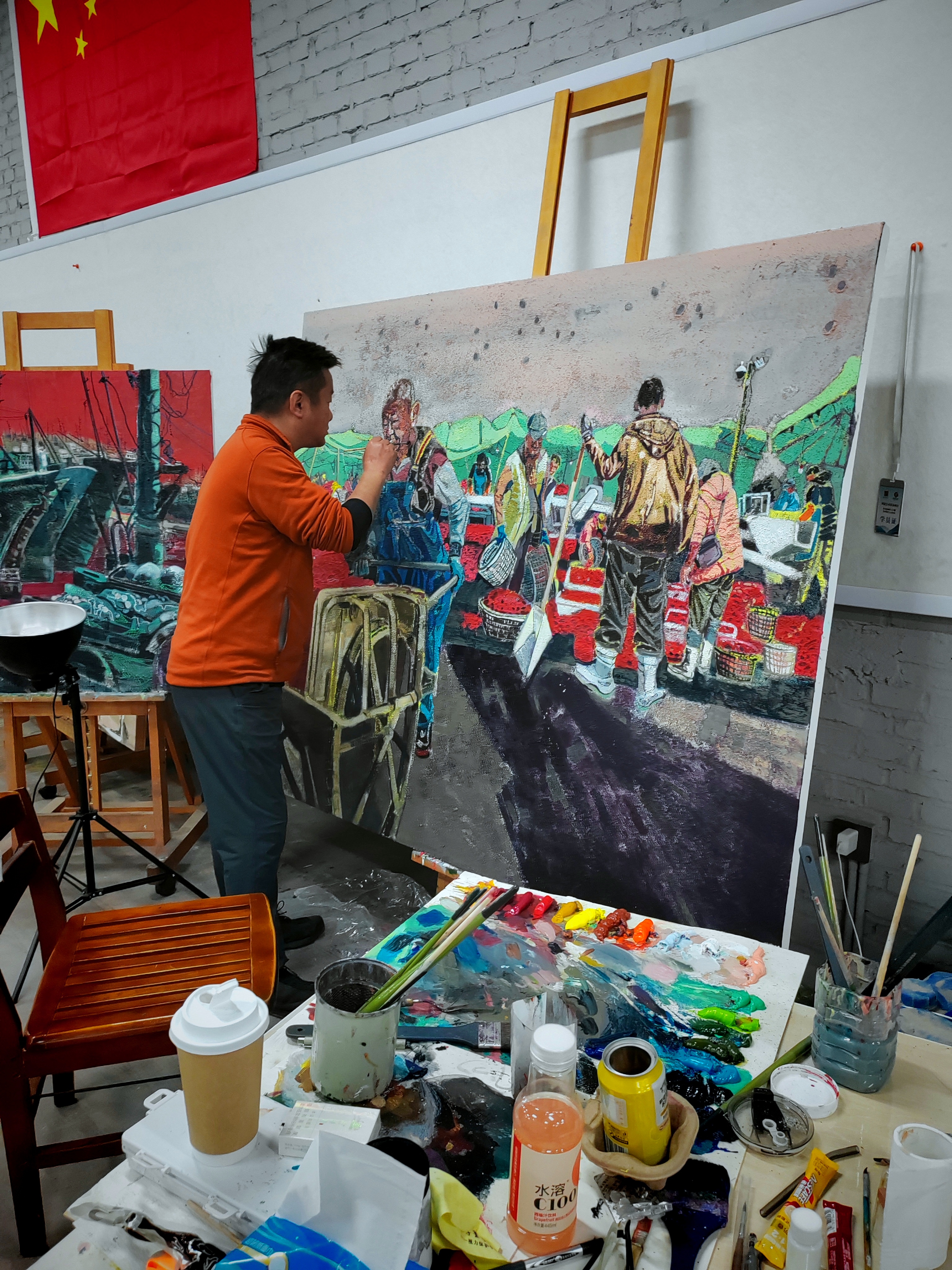 阿虎的创作理念以“扎根生活、捕捉真实、多元探索”为核心,始终围绕地域文化与生活场景构建艺术表达。作为生长于西南阿坝州的藏族艺术家,他的创作根植于本土生活,善于捕捉地域特色鲜明的劳动与生活场景。在艺术表现上,阿虎注重以直接的感官体验为色彩与构图的核心依据。比如此次他在东北创作时,就以“红绿搭配”来表现大连港湾的劳作场景,让作品的视觉表达更具真实性与感染力。