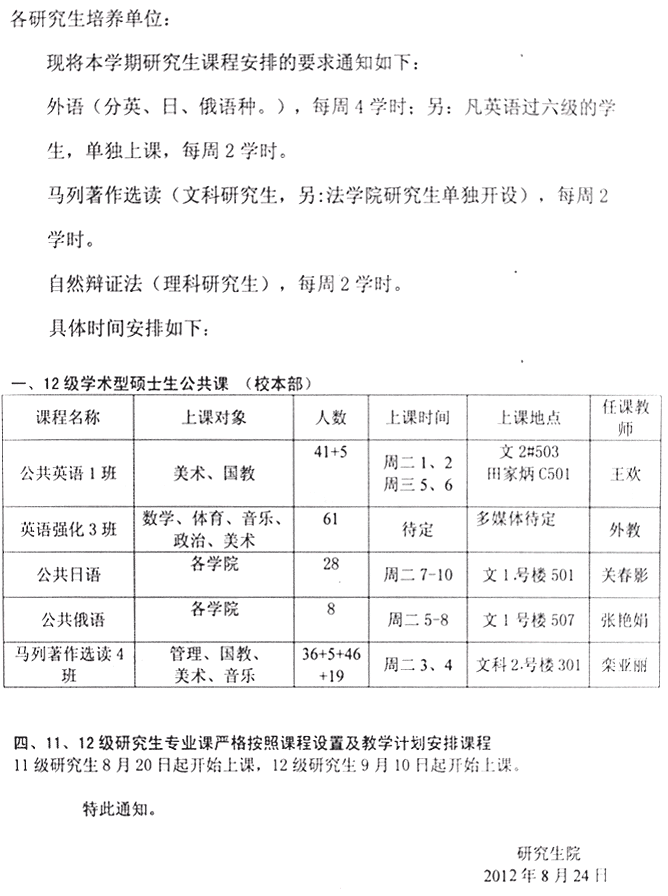 研究生院2012-2013学年第一学期研究生公共课安排
