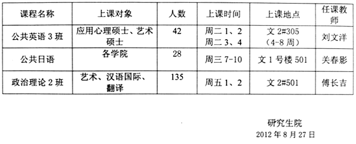 研究生院2012-2013学年第一学期专业学位研究生公共课安排