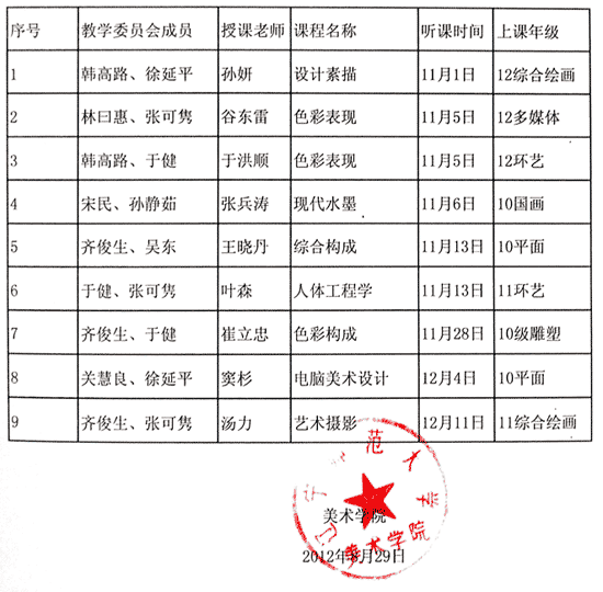 美院2012-2013学年第一学期教学委员会听课计划安排