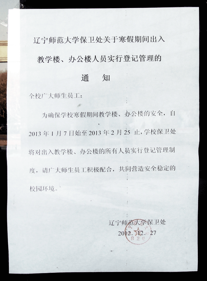 保卫处关于寒假期间出入教学楼、办公楼人员实行登记管理的通知