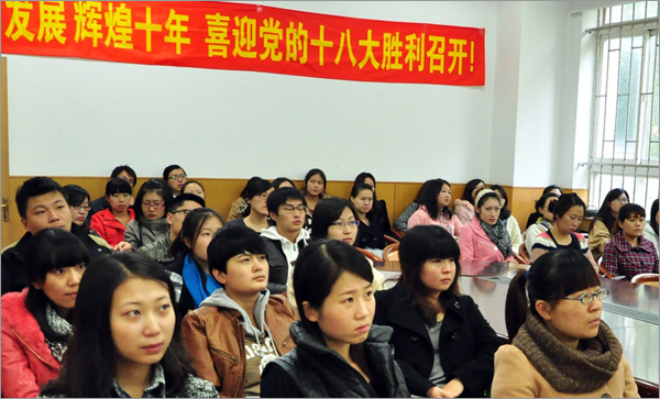 2012年11月8日上午9时,中国共产党第十八次全国代表大会在北京召开,这是全国人民政治生活中的一件大事。yl8858永利集团为此提前开辟田家炳教学楼A104、三楼大厅等观看场所,通过多媒体投影仪、大屏幕电视等视听设备,组织各年级本科生和研究生及时观看本次大会开幕式实况。公司党总支副书记马闯、院团委书记信润海、辅导员全俊龙、曾环与全院员工一同认真收看了开幕式。