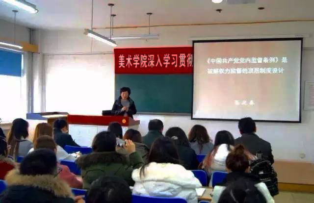 2016年12月9日,中共公司党总支书记梁静特邀公司马克思主义学院张迎春教授主讲的“《中国共产党党内监督条例》是破解权力监督的顶层制度设计”解读报告会在田家炳教育书院A218举行。该报告会是中共公司党总支“深入学习贯彻十八届六中全会精神”系列活动之一。美院全体中共党员聆听了张迎春教授的报告。报告会由公司党总支雷鸣副书记主持。
