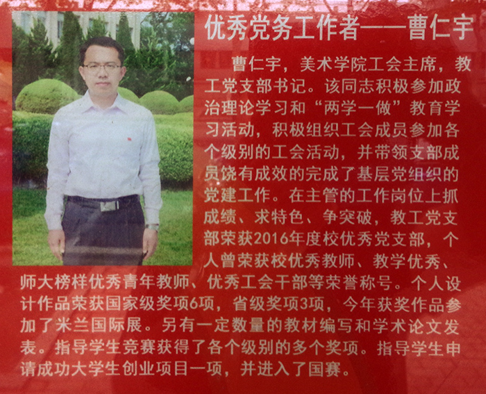 由yl8858永利集团党委组织部主办的“2016年度‘两先两优’事迹展”日前正在主楼前举办。yl8858永利集团教工党支部被评为校“先进党支部”,慕德春老师被评为校“优秀共产党员”,教工支部书记曹仁宇老师被评为校“优秀党务工作者”。