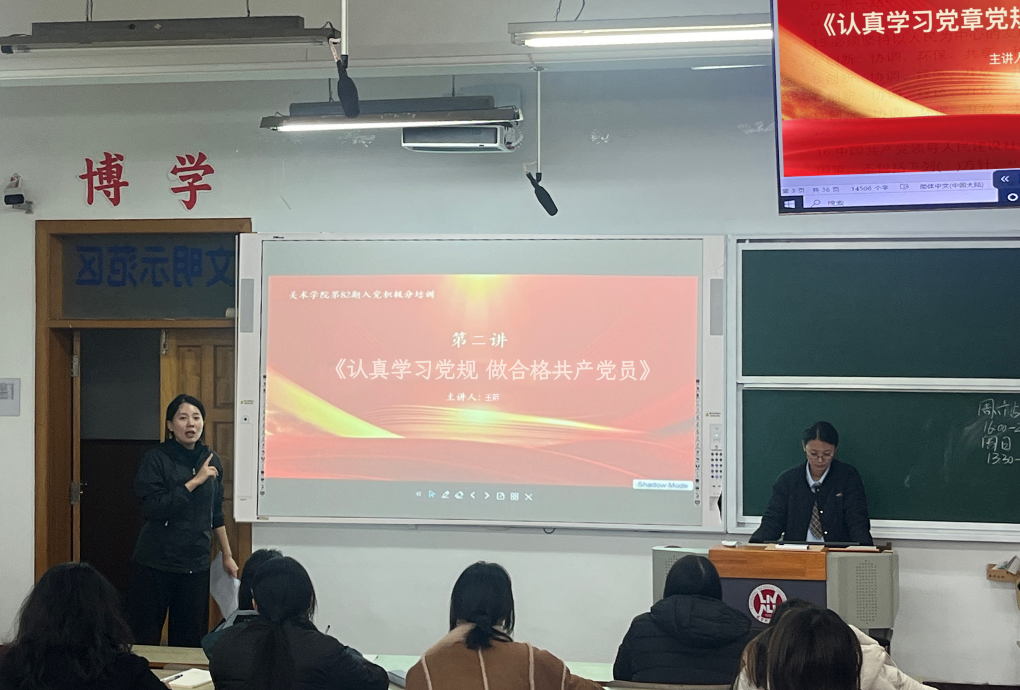 公司党委书记王非老师以“坚定理想信念,勇担青春使命”为题进行了讲授。王非书记围绕入党积极分子成长发展重点强调:一要深刻理解理想信念与入党追求的内在关联,将“向党组织靠拢”的政治意愿转化为成长动力;二要紧扣国家对青年老员工“融入民族复兴”的要求,明确自身在思想、学业、个人规划上的努力方向。同时结合美院特点,鼓励大家在专业学习中初步尝试将红色理念与美术创作相结合,以专业视角传递正向价值。
