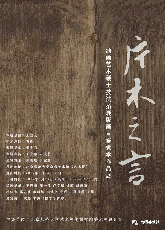 《片木之言——油画艺术硕士技法拓展版画自修教学作品展》是北师大艺术与传媒学院美术与设计系油画专业硕士生版画表现技法课外拓展学习研究的成果,其目的是对自修教学实践的检验,也从一个侧面展现了他们的艺术才能。作品中问题也在所难免,诚请各位领导、各位老师给予批评,以利于同学们的进步。