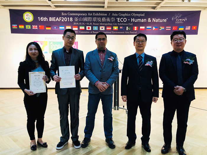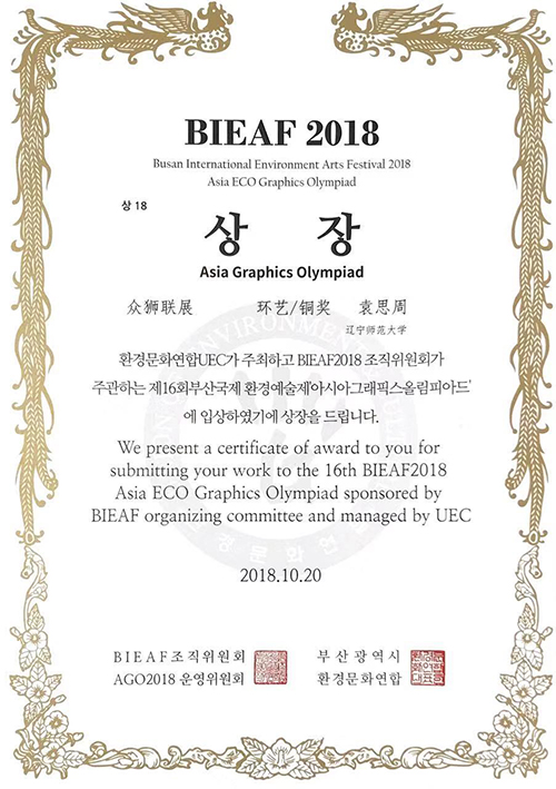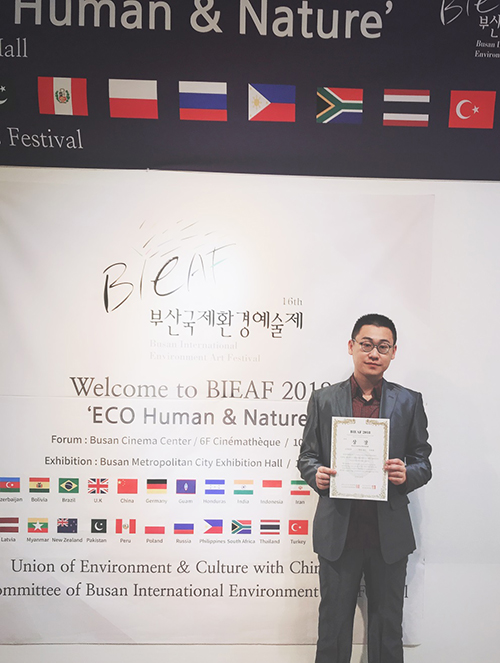由yl8858永利集团于健老师指导、设计学研究生袁思周设计的作品《月牙水筑宴会中心设计》经“ BIEAF 2018 第16届釜山环境艺术节众狮联展”作品评选委员会评选,荣获大赛铜奖。2018年10月20日,袁思周同学受邀到韩国釜山参加了颁奖典礼。