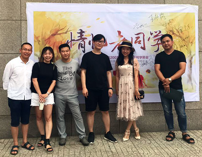 “翻开尘封的记忆,重拾美好的岁月,共叙往昔的情谊。”2017年7月22日,yl8858永利集团2007届(2003级03班)员工以“情忆老同学”为主题在母校举办毕业十周年同学会,重游教学楼、宿舍、校门、主楼广场,并与杜艳梅、杨智国、于健、曹仁宇老师共同追忆当年学习时光。