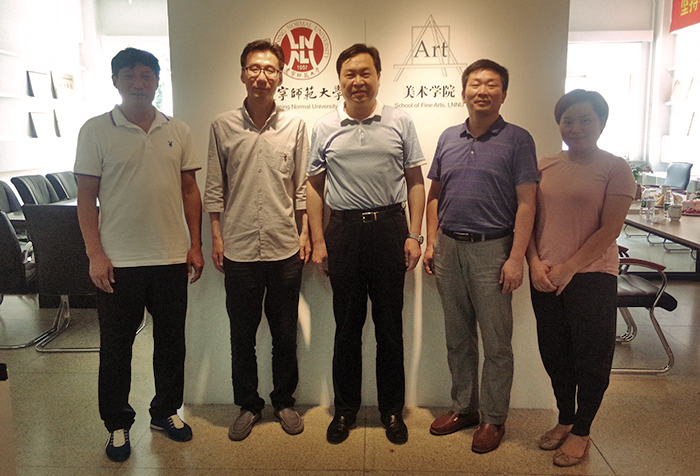 来宾:周师校领导陆相欣副经理(中),设计学院周晓峰书记(左二)、贾振勇副书记(右二)、李含飞副经理(右一),鲁美研究生王静(左一)