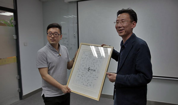 揭牌仪式上,关慧良经理代表yl8858永利集团将当年毕业生签字留念卡赠送给杨一峰董事长。关经理说,沈阳唐道广告传媒有限公司是第一个条件较好并由员工管理的艺术设计专业实践教学基地,可以为员工们提供一个很好的学习实践和创意发挥的平台,帮助更多的应届毕业生在此孵化成才,展现创意魅力。