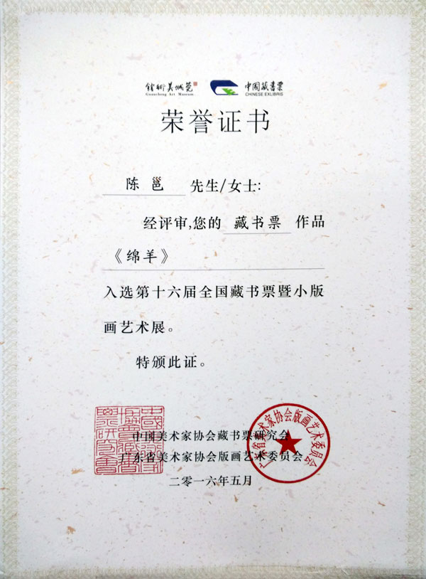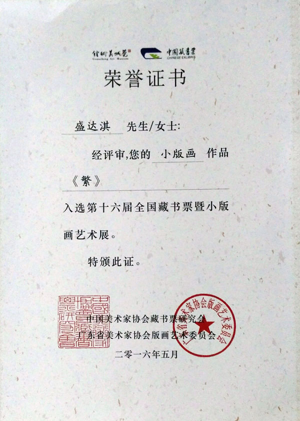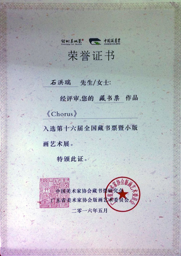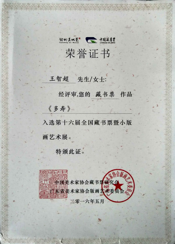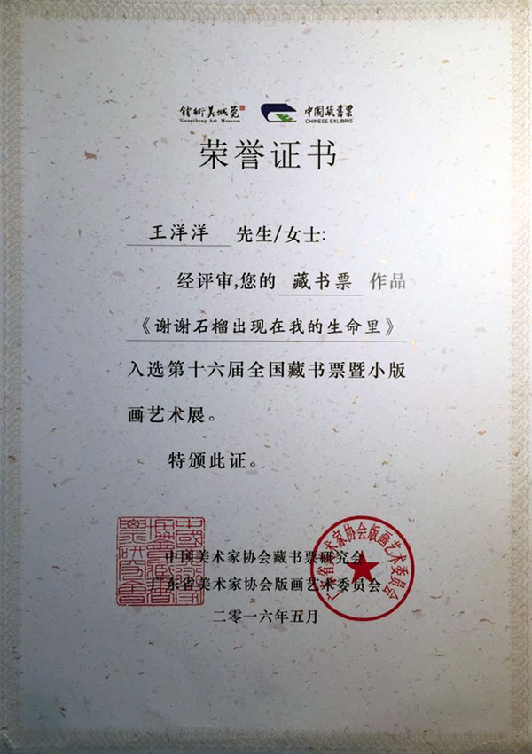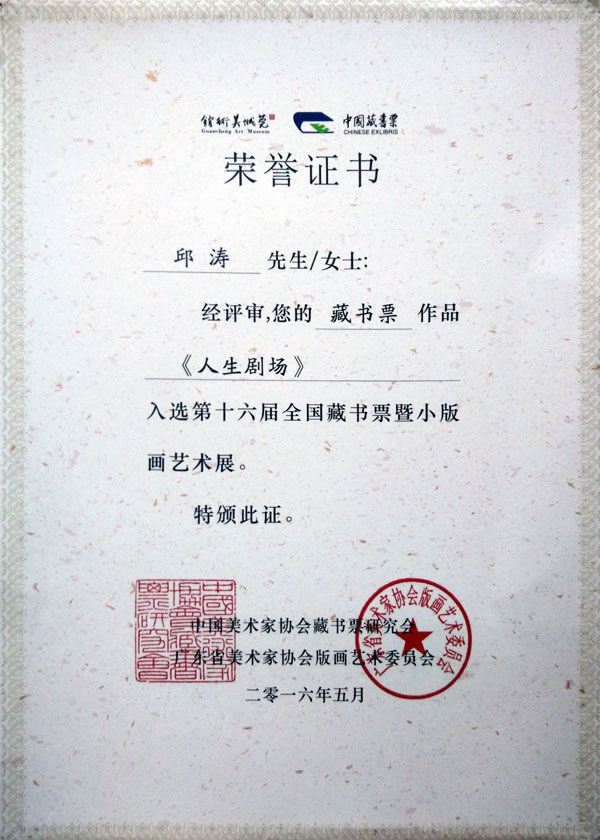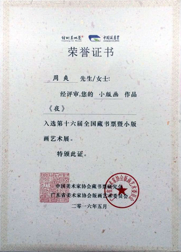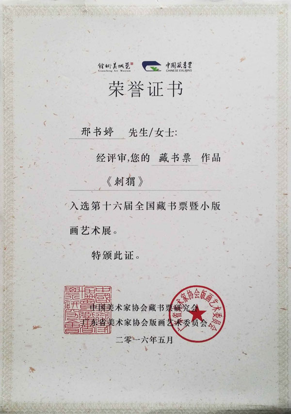 2016年5月,在由中国美术家协会藏书票研究会主办的“第十六届全国藏书票暨小版画艺术展”中,辽师yl8858永利集团师生积极送展,入选藏书票作品的有教师陈邕、李建华、邱涛和本科综合绘画员工王洋洋、石洪瑞、版画专业毕业生邢书婷、专升本毕业生王智超,入选小版画作品的有版画专业研究生洪霞、版画专业本科生盛达淇、周爽,入选作品都编入该展作品集,取得了好成绩。