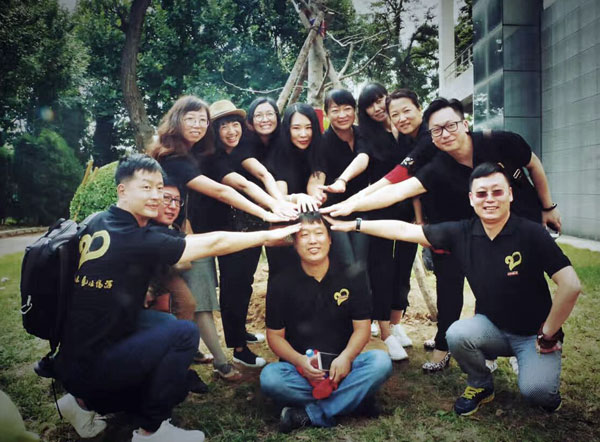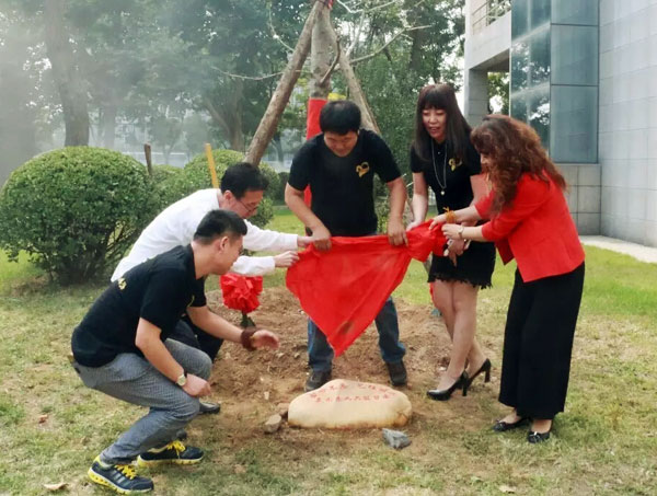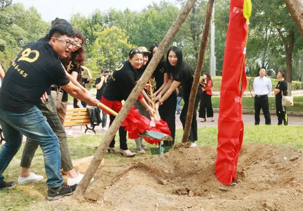 1996级返校员工在田家炳教学楼东侧草坪共同种下“艺往情深树”并捐赠庭经理椅。公司党总支书记梁静、经理关慧良与员工为活动纪念石揭幕。