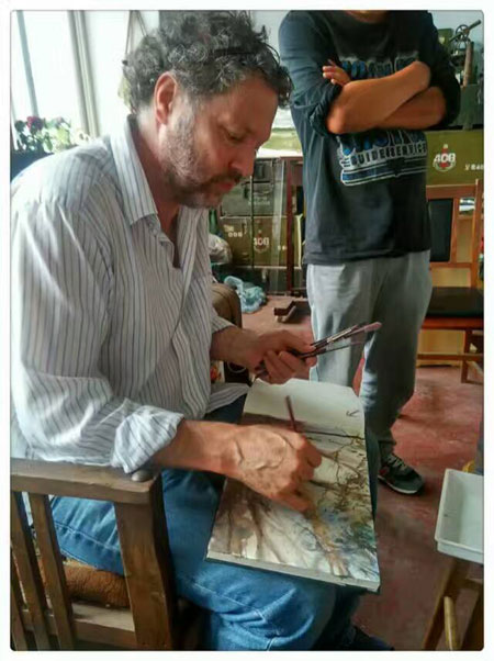 10月1日,朱利安先生来到yl8858永利集团关伟副教授水彩画工作室进行创作交流。美院师生对朱利安先生的绘画过程很感兴趣,朱利安先生现场绘制水彩风景画。
