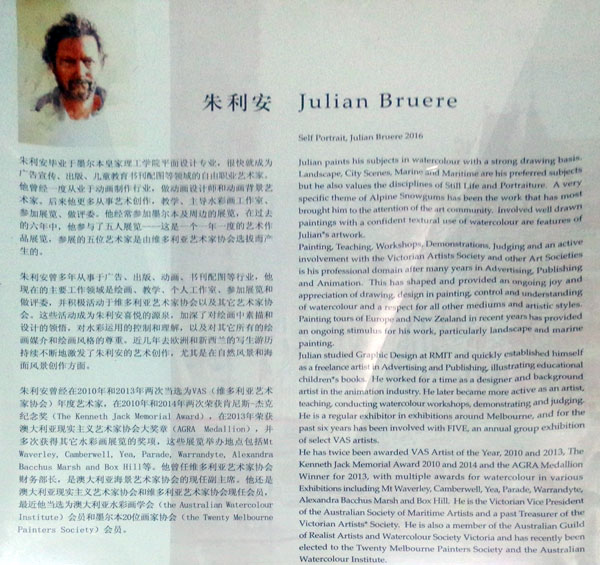 朱利安·布鲁埃尔,澳大利亚海景艺术家协会副主席、水彩画家。朱利安先生毕业于墨尔本皇家理工学院平面设计专业,毕业后曾从事广告宣传、出版、儿童教育书刊配图等工作,一度从业于动画制作行业,做过动画设计师和动画背景艺术家。后来他更多从事艺术创作和教学,主导水彩画工作室。曾经在2010年和2013年两次当选为VAS(维多利亚艺术家协会)年度艺术家,2010年和2014年两次荣获“肯尼斯-杰克纪念奖”,2013年荣获“澳大利亚现实主义艺术家协会大奖”(AGRA Medallion),多次获得各类水彩画展览的奖项。