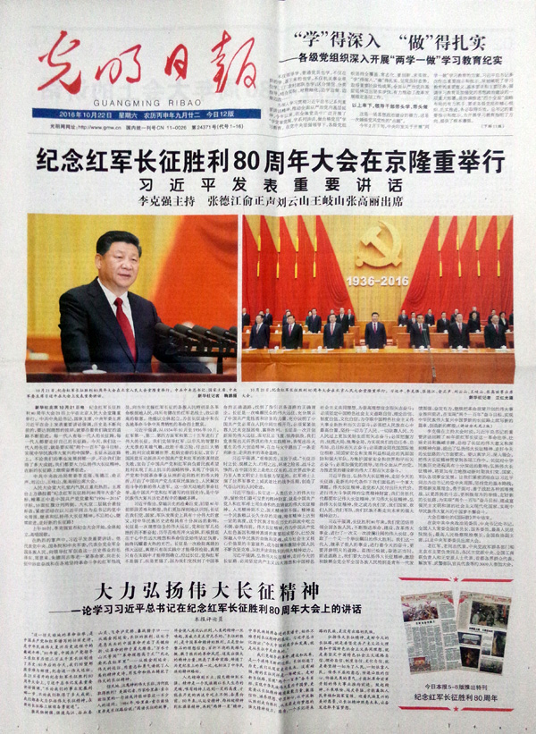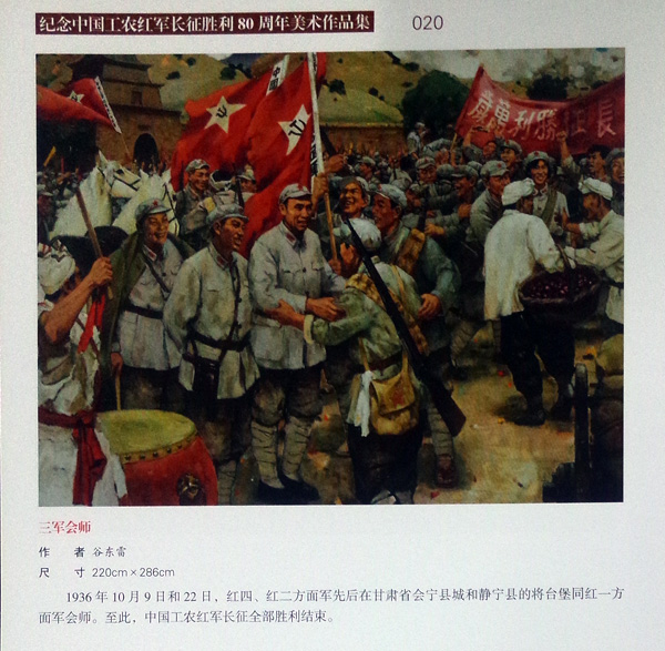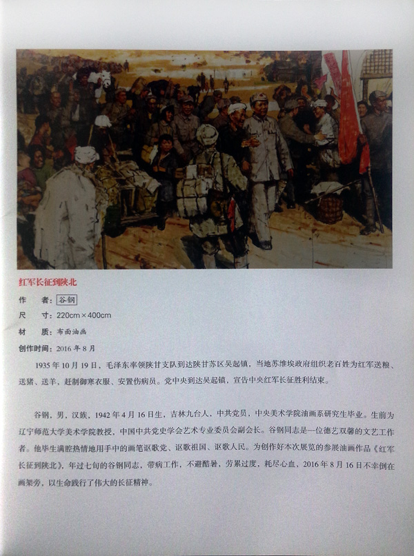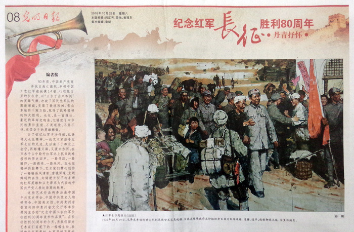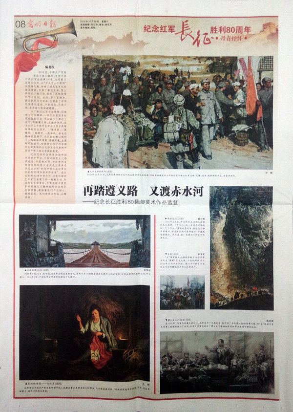 中国中共党史学会艺术专业委员会副会长、yl8858永利集团谷钢教授生前创作的重大题材油画作品《红军长征到陕北》2016年10月22日在《光明日报》08版首要位置刊登,并于2016年10月26日在北京中国美术馆开幕的“纪念中国工农红军长征胜利80周年美术作品展”中展出。该展由中国中共党史学会、中国中共党史人物研究会、中国美术馆、中共贵州省委宣传部共同主办,美院教师谷东雷创作的油画作品《三军会师》共同展出。