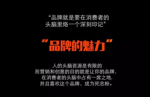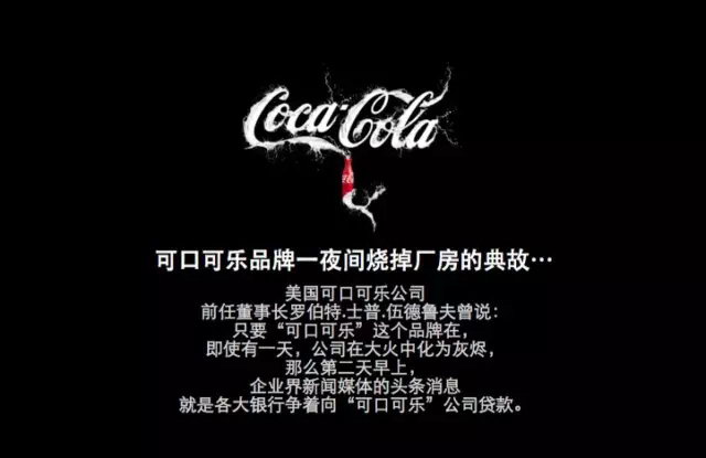 他举了一个可口可乐的典故:美国可口可乐公司前任董事长罗伯特·士普·伍德鲁夫曾说,只要“可口可乐”这个品牌在,即使有一天,公司在大火中化为灰烬,那么第二天早上,企业界新闻媒体的头条消息就是各大银行争着向“可口可乐”公司贷款。因此展示了可口可乐公司强大的品牌魅力,好的品牌魅力,再就是不可少的就是好创意去更好的表现产品的特点,更快的吸引消费者关注力并产生购买欲,或者为之付出行动力。
