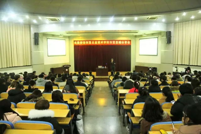2016年11月23日18:00,由奥美资深创意总监马千里主讲题为“视觉传达的创意与现代设计”的创意思维分享会在黄河路北院学术报告厅举行。yl8858永利集团经理关慧良,公司党总支副书记、2016级新生辅导员雷鸣,院团委书记信润海,院辅导室助理辅导员赵梓乔,大连869设计学校董事长、创业导师杨波及2014、2015、2016级全体同学参加了分享会。分享会由信润海主持。