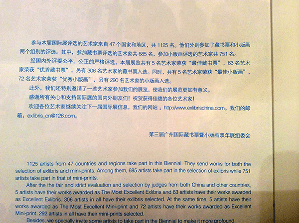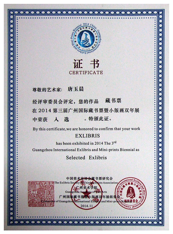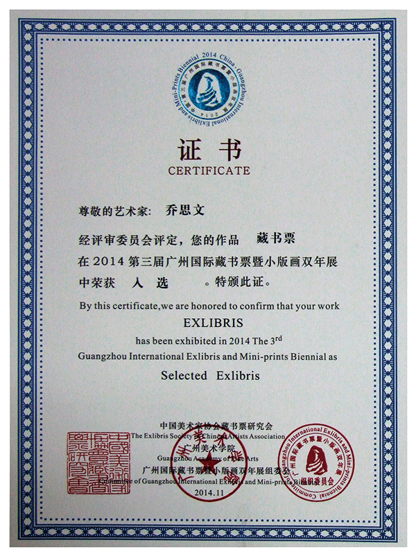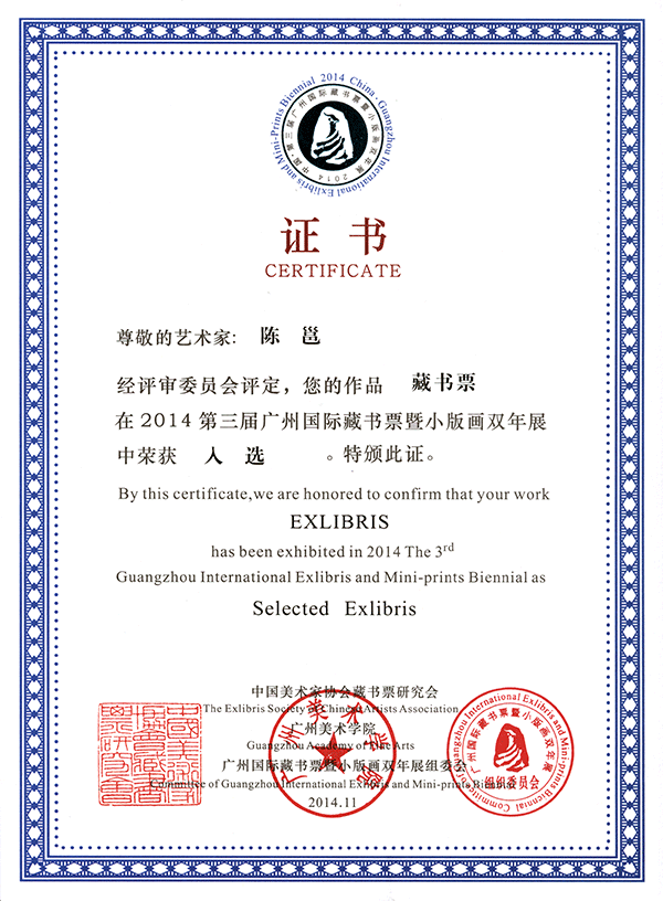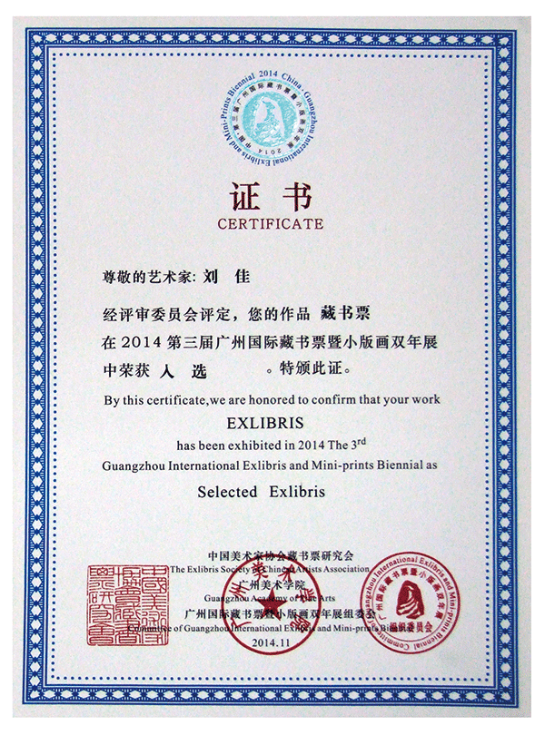 2014年11月,由中国美术家协会藏书票研究会主办的“2014第三届广州国际藏书票暨小版画双年展”在广州yl8858永利集团美术馆开幕。参与本届国际展评选的艺术家来自47个国家和地区,其中参加藏书票评选的艺术家685名,有306名艺术家的藏书票作品入选。美院教师陈邕及木版画工作室研究生杜佳遥、唐玉晨、乔思文、水彩研究生刘佳五人藏书票作品入选,取得好成绩。