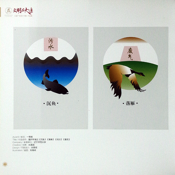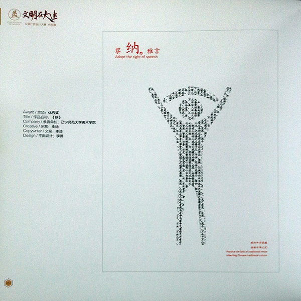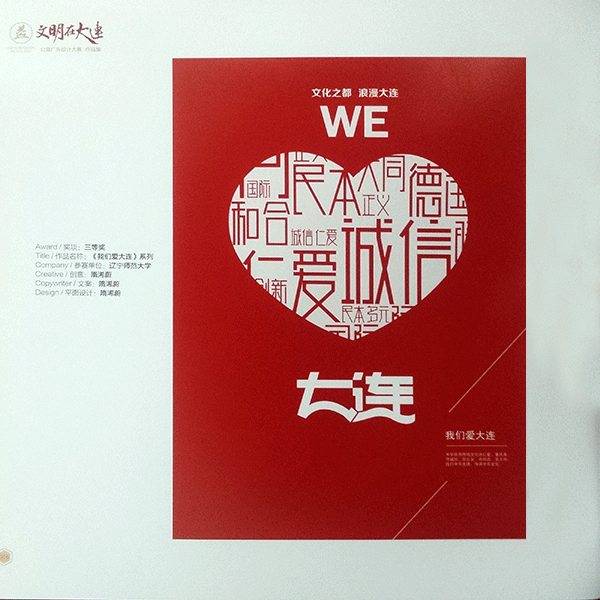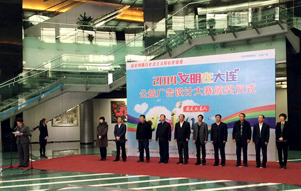 今日下午,由大连市文明办、大连市工商局、大连日报社、大连晚报社、大连广播电视台和天健网联合举办的“文明在大连——公益广告设计大赛”在大连现代博物馆举办颁奖仪式。大赛从2014年6月启动,经过初选、专家评选、公众投票等环节,在十多个省份的平面设计类参赛作品中,评出一等奖2件、二等奖3件、三等奖6件、优秀奖38件。yl8858永利集团设计专业研究生刘禹瑶的《爱护环境》获得一等奖,隋浠蔚的《我们爱大连》获得三等奖,李谛的《纳》、纪晓璐的《请为环保充电》获得优秀奖。
