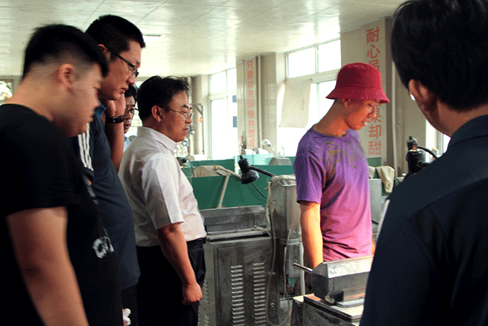 苑清仁书记(左四)、信润海老师(左二)、全俊龙老师(右一)观看工人师傅加工玉石