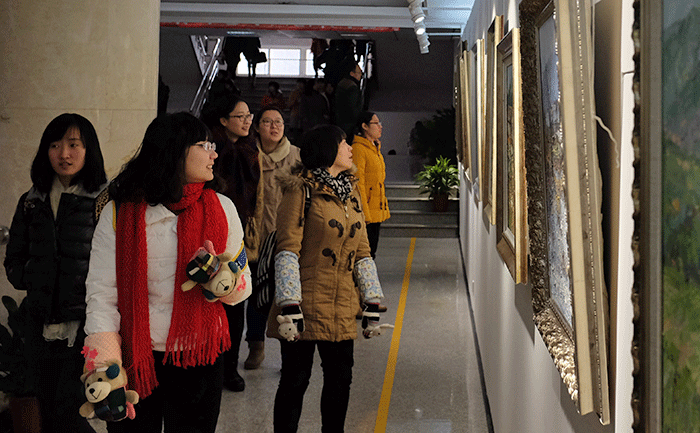 各界来宾和美院师生观看专业基地揭牌后的首场艺术家个人作品展“何彤风景油画展”