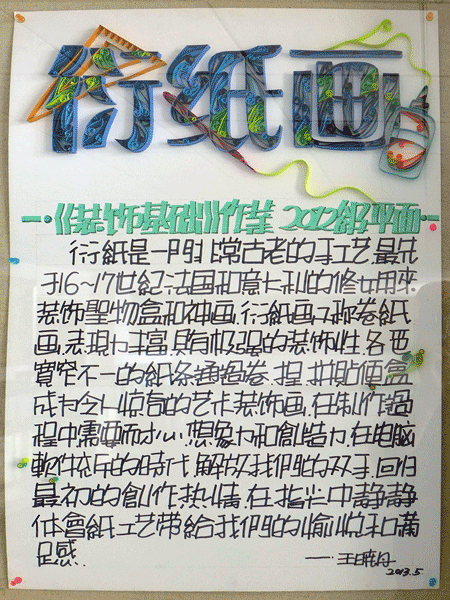 2013年5月,题为“衍纸画”的视觉传达设计专业2012级“装饰基础”课程作业展在田家炳教学楼四楼大厅举办,共展出43幅员工作品。“装饰基础”课程由王晓丹老师授课。