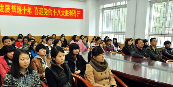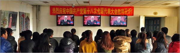 “科学发展辉煌十年、喜迎党的十八大胜利召开!”2012年11月8日上午9时,公司党总支书记苑清仁携全院教职员工及各年级员工一同准时收看中国共产党第十八次全国代表大会的开幕式实况,共同收听胡锦涛总书记的重要工作报告。公司党总支充分重视十八大专题学习活动,开辟田家炳教学楼A区104会议室、三楼大厅等地点作为十八大专题学习场所。院团委与办公室有序组织员工,提前布置好各会场,调配多媒体投影仪、大屏幕电视等视听设备,充分保证了收看和学习的效果。