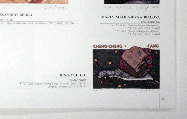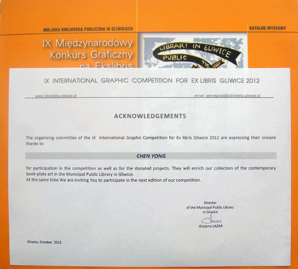 2012年11月,在波兰举办的“格莱维兹国际藏书票双年展”中,美院木版画工作室教师陈邕的作品《火车——关伟藏书》、09级研究生刘冰月的作品《蜗牛》、10级研究生李世超的作品《中国龙》入选该展,陈邕、刘冰月作品入编展览图录。