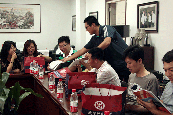 全俊龙老师(左一)向鞍山市员工介绍宣传资料内容