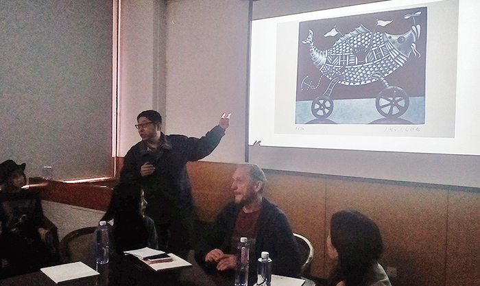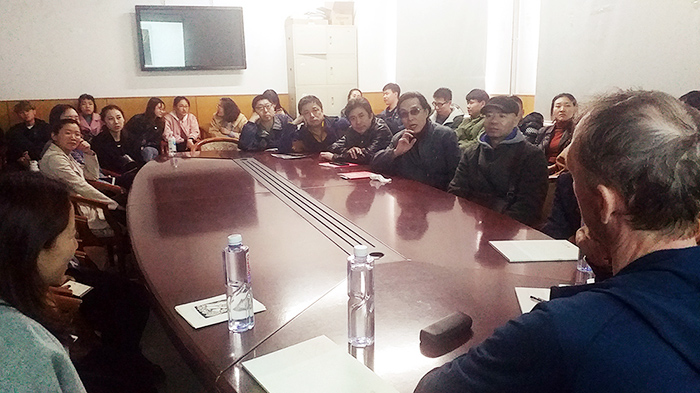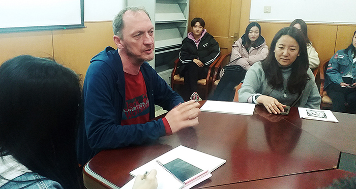 库布里克先生向美院师生介绍自己的从艺经历,结合版画和藏书票作品阐释独特的创作理念,引起师生共鸣。美院教师在中西方艺术理念、风格流派、制作技法等方面与库布里克先生充分互动。陈邕教授还向来宾展示了美院版画专业师生作品,气氛热烈。