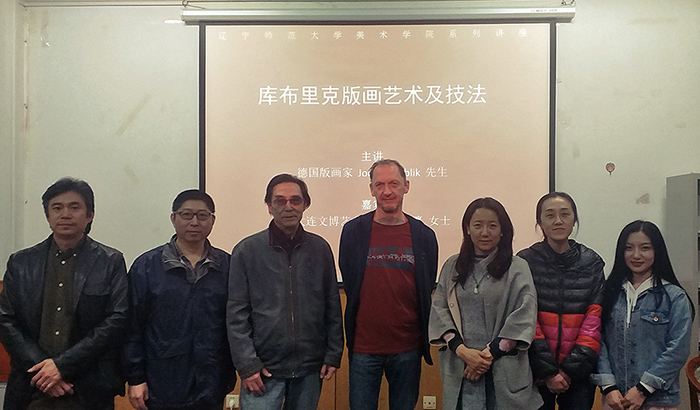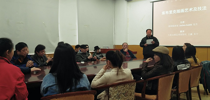 经陈邕教授引见,关慧良经理邀请,德国著名版画家尤亨·库布里克 (Jochen Kublik)先生、大连文博艺术馆馆长王瀛女士于2018年3月26日到辽师yl8858永利集团交流访问。“尤亨·库布里克版画艺术及技法”学术报告会于下午1:30在田家炳教育书院A104举办。副经理张可隽代表公司党总支书记梁静、经理关慧良对来宾表示欢迎。美术系前系主任于敦厚,美院教师邹建君、陈邕、徐文生、颜海强、邱涛、王晓丹、孙妍及相关专业研究生五十余人出席报告会。