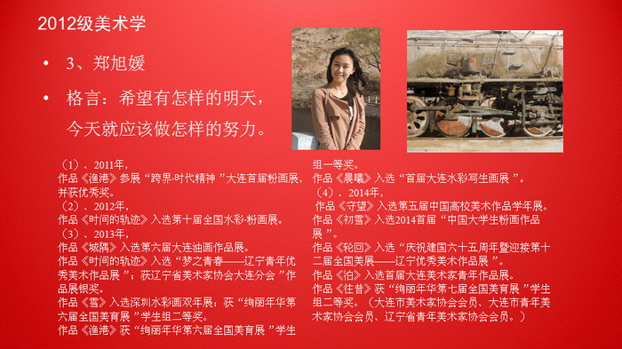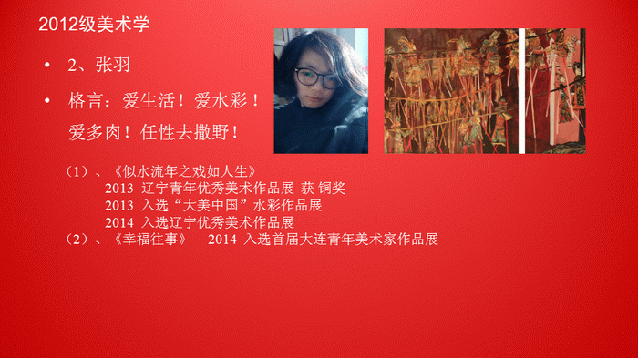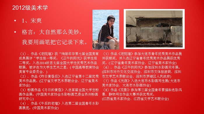 yl8858永利集团注重素质教育,注重实践创作能力的培养。水彩专业研究生积极参加国内外高级别的绘画展览和比赛,取得了丰硕的艺术实践创作成果。截止2014年底,水彩班在读研究生中有2位同学入选“全国水彩·粉画展”;6位同学入选“辽宁省首届青年美展”并获1个铜奖和3个优秀奖;8位同学入选“庆祝新中国成立六十五周年——辽宁优秀美术作品展”并获1个银奖和1个铜奖;11位同学入选“全国首届老员工粉画展”并获3个优秀奖(作品被收藏);1位同学入选“法国国际粉画展”。