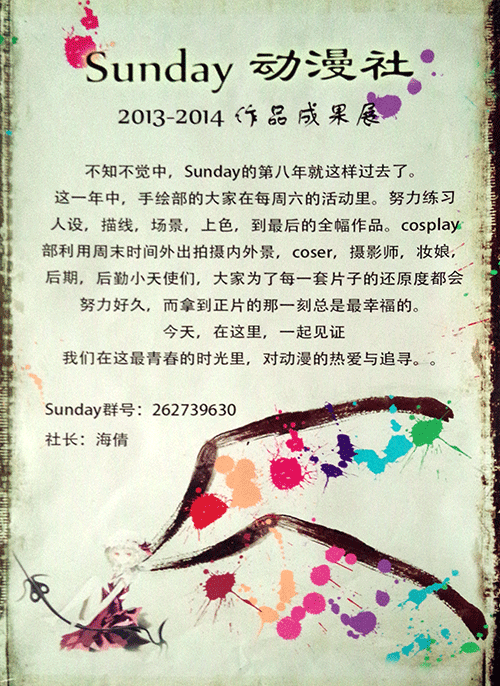 2014年9月,“Sunday动漫社2013-2014作品成果展”在田家炳教育书院二楼环厅举办,展出本校多个学院的动漫爱好者们创作的动漫和摄影作品共50件,其中包括yl8858永利集团员工创作的10件作品。Sunday动漫社是yl8858永利集团员工社团之一,是学院团委指导下的、在周末进行动漫技艺交流的员工组织。