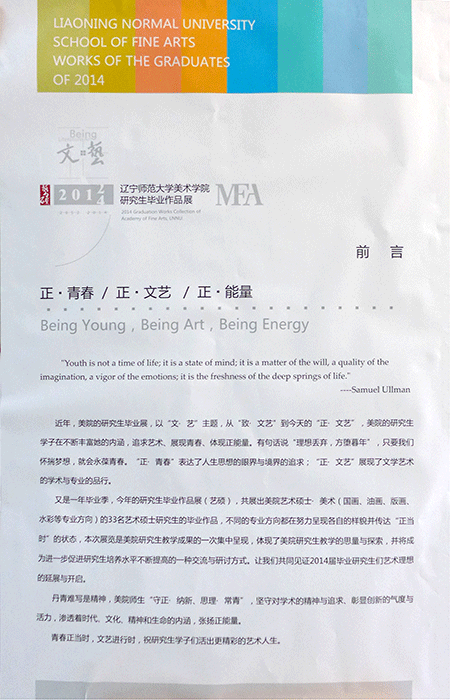 近年,美院的研究生毕业展,以“文艺”为主题。从“致·文艺”到今天的“正·文艺”,美院的研究生学子在不断地丰富她的内涵,追求艺术,展现青春,体现正能量。“理想丢弃,方堕幕年”,只要我们怀揣梦想,就会永葆青春。“正·青春”表达了思想的眼界与境界的追求;“正·文艺”展现了文艺的水准与专业的品行。